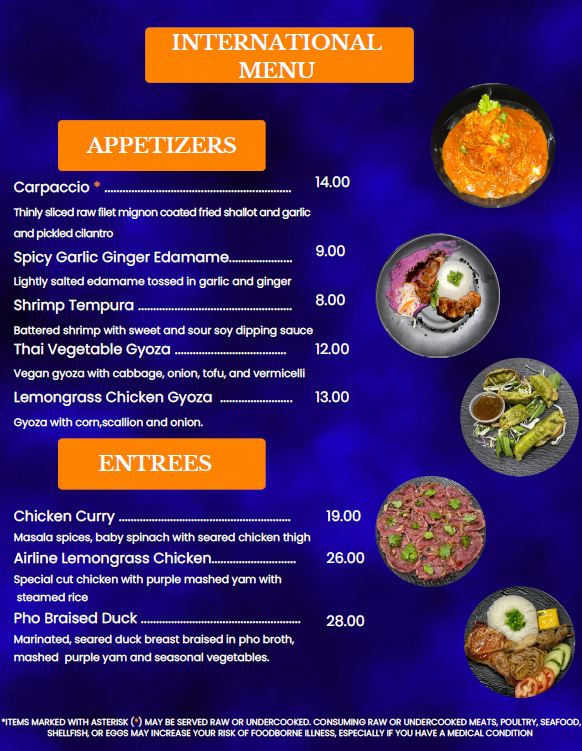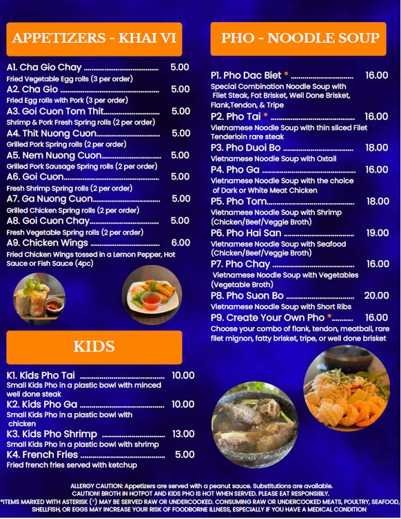 Create your own pho! Choose whatever meats you'd like and even extra meat if you'd like with the options tab. *Tai steak may be served raw or undercooked. CAUTION: Stone bowls may keep the broth VERY hot. Let cool or you may risk the chance of burning yourself. Items with an asterisk (*) may be served undercooked or raw. Consuming raw or undercooked meats, or eggs may increase your risk of foodborne illness, especially if you have certain medical conditions.