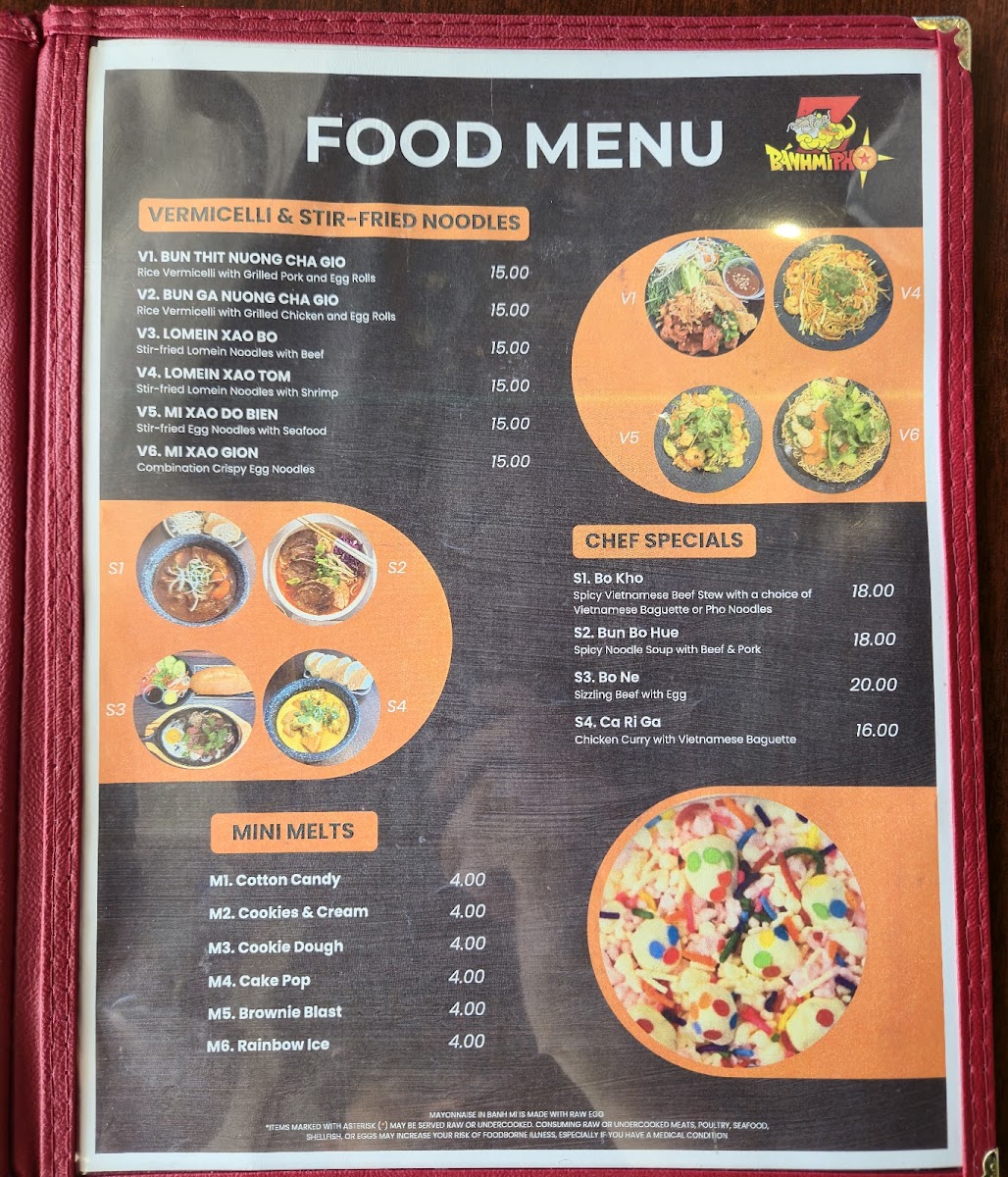 Vietnamese French bread with fried egg. OUR MAYONNAISE CONTAINS RAW EGGS. *MAY BE SERVED RAW OR UNDERCOOKED. CONSUMING RAW OR UNDERCOOKED MEATS, POULTRY, SEAFOOD, OR EGGS MAY INCREASE YOUR RISK OF FOODORNE ILLNESS, ESPECIALLY IF YOU HAVE A MEDICAL CONDITION.